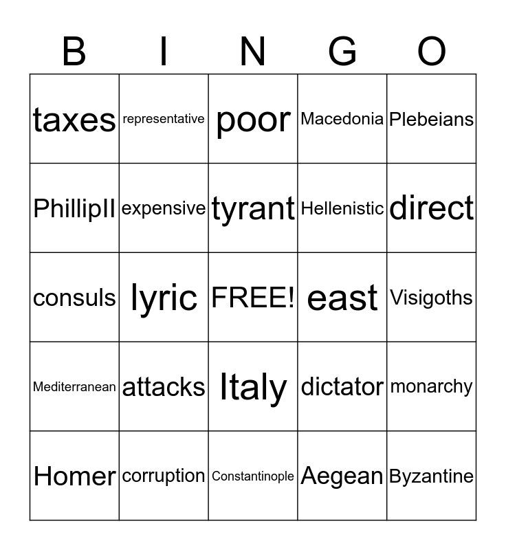This bingo card has a free space and 29 words: Homer, mythology, lyric, fables, taxes, poor, expensive, attacks, east, corruption, Visigoths, Byzantine, Constantinople, Aegean, direct, patricians, Italy, Mediterranean, Plebeians, consuls, dictator, Minoans, Hellenistic, PhillipII, Macedonia, representative, monarchy, tyrant and oligarchy.