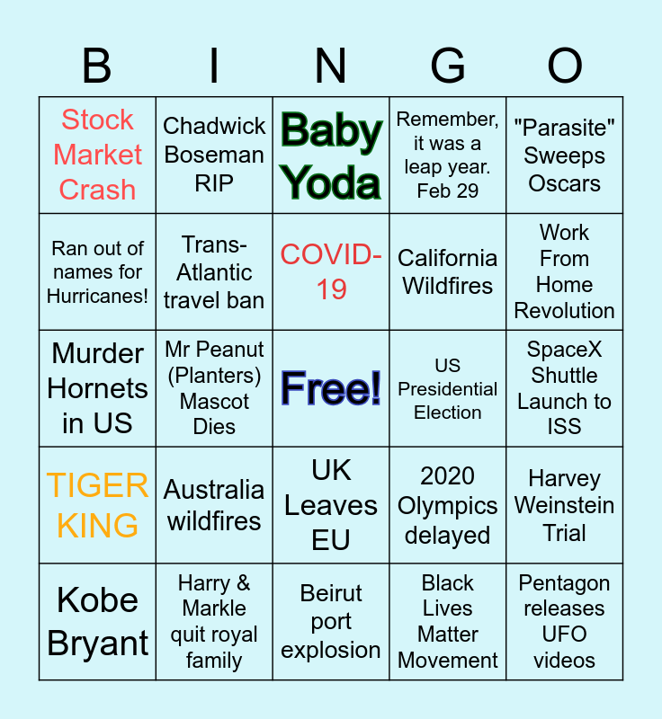 This bingo card has a free space and 24 words: Australia wildfires, Harry & Markle quit royal family, COVID-19, Kobe Bryant, "Parasite" Sweeps Oscars, Stock Market Crash, Ran out of names for Hurricanes!, Chadwick Boseman RIP, US Presidential Election, UK Leaves EU, California Wildfires, Murder Hornets in US, 2020 Olympics delayed, Harvey Weinstein Trial, Trans-Atlantic travel ban, Black Lives Matter Movement, SpaceX Shuttle Launch to ISS, Baby Yoda, Work From Home Revolution, Mr Peanut (Planters) Mascot Dies, Pentagon releases UFO videos, TIGER KING, Remember, it was a leap year. Feb 29 and Beirut port explosion.