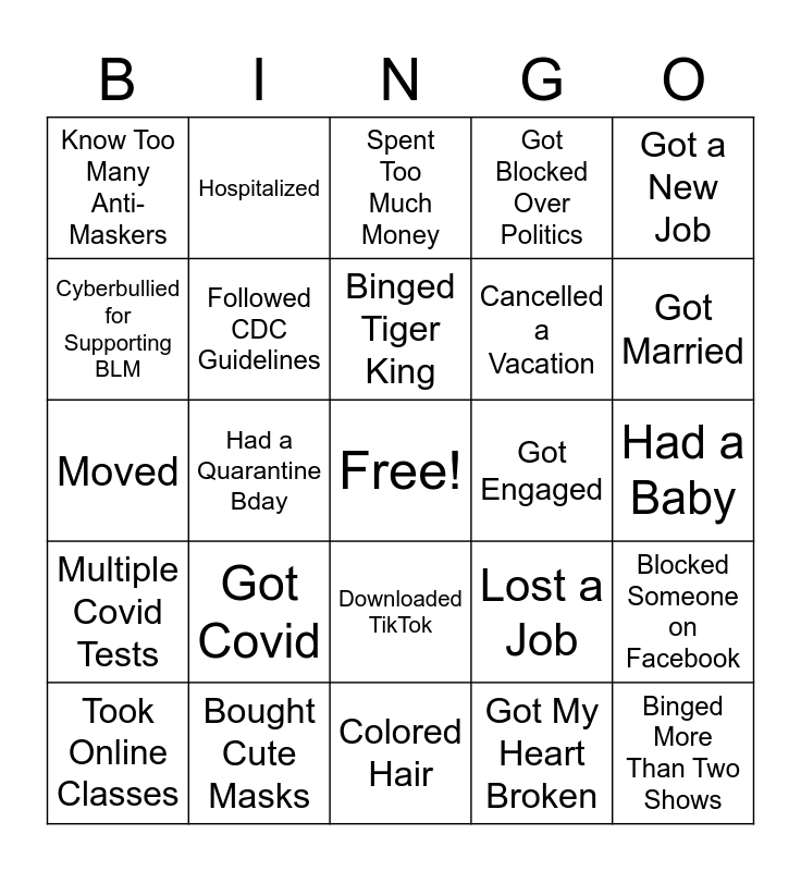 This bingo card has a free space and 24 words: Got Covid, Bought Cute Masks, Binged Tiger King, Took Online Classes, Got a New Job, Know Too Many Anti-Maskers, Cyberbullied for Supporting BLM, Hospitalized, Got Engaged, Downloaded TikTok, Cancelled a Vacation, Moved, Lost a Job, Blocked Someone on Facebook, Followed CDC Guidelines, Got My Heart Broken, Had a Baby, Spent Too Much Money, Got Married, Had a Quarantine Bday, Binged More Than Two Shows, Multiple Covid Tests, Got Blocked Over Politics and Colored Hair.