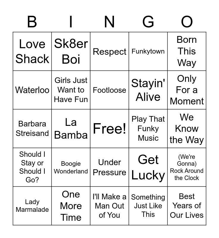This bingo card has a free space and 34 words: Blinding Lights, Something Just Like This, You Belong With Me, Oops! I Did It Again, Should I Stay or Should I Go?, Girls Just Want to Have Fun, Born This Way, Lady Marmalade, Sk8er Boi, Build Me up Buttercup, Footloose, Respect, Hashem Melech, September, Play That Funky Music, Only For a Moment, One More Time, Barbara Streisand, Boogie Wonderland, Get Lucky, Under Pressure, Bang a Gong, Love Shack, We Know the Way, I'll Make a Man Out of You, Best Years of Our Lives, Funkytown, Cat's In The Cradle, Stayin' Alive, Waterloo, Machoman, La Bamba, (We're Gonna) Rock Around the Clock and Blame it on the Boogie.