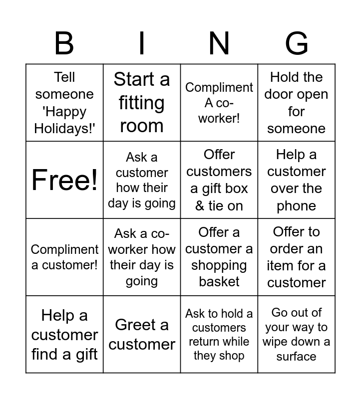 This bingo card has 16 words: Greet a customer, Offer to order an item for a customer, Compliment A co-worker!, Tell someone 'Happy Holidays!', Compliment a customer!, Start a fitting room, Offer a customer a shopping basket, Ask to hold a customers return while they shop, Free!, Ask a customer how their day is going, Help a customer find a gift, Hold the door open for someone, Ask a co-worker how their day is going, Help a customer over the phone, Offer customers a gift box & tie on and Go out of your way to wipe down a surface.