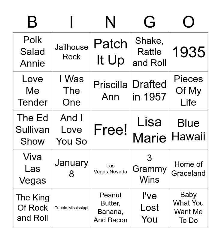 This bingo card has a free space and 24 words: January 8, Tupelo,Mississippi, Priscilla Ann, The King Of Rock and Roll, 1935, Polk Salad Annie, Love Me Tender, Jailhouse Rock, Lisa Marie, Las Vegas,Nevada, Drafted in 1957, The Ed Sullivan Show, 3 Grammy Wins, Home of Graceland, I Was The One, I've Lost You, Blue Hawaii, Patch It Up, Pieces Of My Life, And I Love You So, Baby What You Want Me To Do, Viva Las Vegas, Shake, Rattle and Roll and Peanut Butter, Banana, And Bacon.