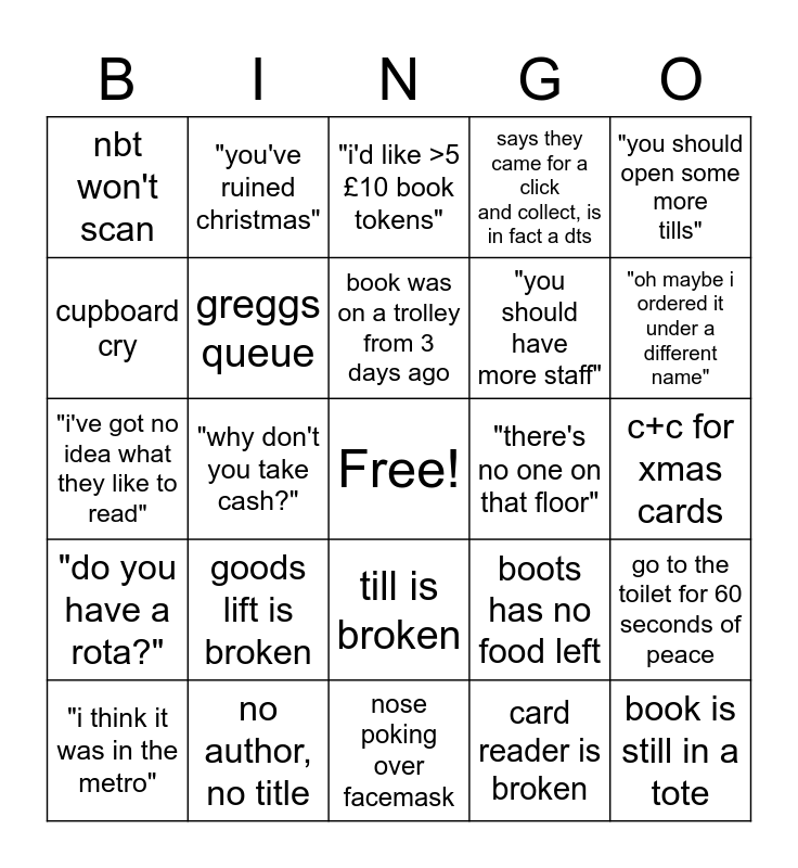 This bingo card has a free space and 24 words: goods lift is broken, no author, no title, book was on a trolley from 3 days ago, "i think it was in the metro", "you should open some more tills", nbt won't scan, cupboard cry, "you've ruined christmas", "there's no one on that floor", till is broken, "you should have more staff", "i've got no idea what they like to read", boots has no food left, go to the toilet for 60 seconds of peace, greggs queue, card reader is broken, c+c for xmas cards, "i'd like >5 £10 book tokens", "oh maybe i ordered it under a different name", "why don't you take cash?", book is still in a tote, "do you have a rota?", says they came for a click and collect, is in fact a dts and nose poking over facemask.