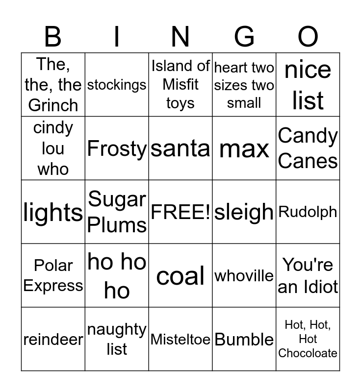 This bingo card has a free space and 24 words: ho ho ho, naughty list, santa, reindeer, nice list, The, the, the Grinch, cindy lou who, stockings, sleigh, coal, max, lights, whoville, You're an Idiot, Frosty, Bumble, Rudolph, Island of Misfit toys, Candy Canes, Sugar Plums, Hot, Hot, Hot Chocoloate, Polar Express, heart two sizes two small and Misteltoe.