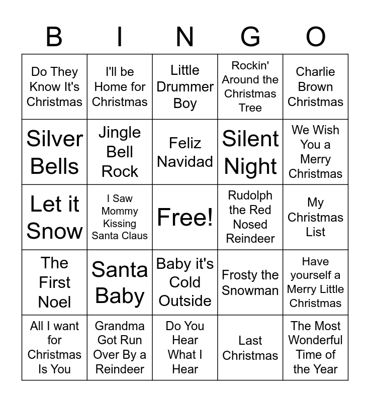 This bingo card has a free space and 28 words: Have yourself a Merry Little Christmas, Santa Claus is Coming to Town, Silent Night, Last Christmas, Silver Bells, Little Drummer Boy, I'll be Home for Christmas, The First Noel, Rudolph the Red Nosed Reindeer, All I want for Christmas Is You, Let it Snow, Rockin' Around the Christmas Tree, Grandma Got Run Over By a Reindeer, Do You Hear What I Hear, We Wish You a Merry Christmas, Joy to the World, Santa Baby, Jingle Bell Rock, Feliz Navidad, Baby it's Cold Outside, Do They Know It's Christmas, Let it Snow, Let it Snow, Let it Snow, The Most Wonderful Time of the Year, I Saw Mommy Kissing Santa Claus, My Christmas List, Frosty the Snowman, Charlie Brown Christmas and Baby It's Cold Outside.