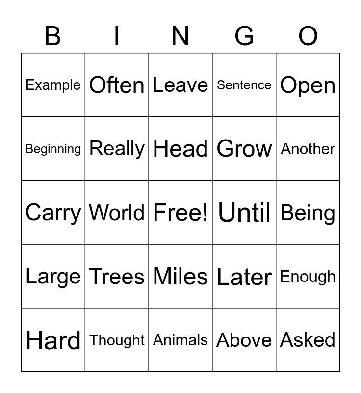 This bingo card has a free space and 24 words: Trees, Thought, Head, Hard, Open, Example, Beginning, Often, Until, Miles, Grow, Carry, Later, Enough, Really, Above, Being, Leave, Another, World, Asked, Large, Sentence and Animals.