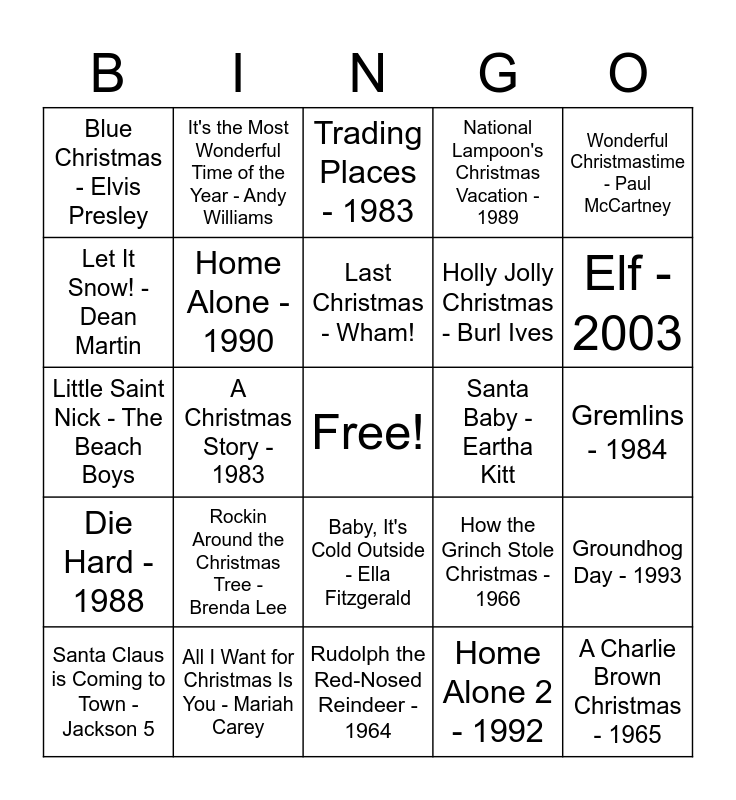 This bingo card has a free space and 24 words: Rockin Around the Christmas Tree - Brenda Lee, All I Want for Christmas Is You - Mariah Carey, Last Christmas - Wham!, Santa Claus is Coming to Town - Jackson 5, Wonderful Christmastime - Paul McCartney, Blue Christmas - Elvis Presley, Let It Snow! - Dean Martin, It's the Most Wonderful Time of the Year - Andy Williams, Santa Baby - Eartha Kitt, Baby, It's Cold Outside - Ella Fitzgerald, Holly Jolly Christmas - Burl Ives, Little Saint Nick - The Beach Boys, How the Grinch Stole Christmas - 1966, Groundhog Day - 1993, Home Alone - 1990, Home Alone 2 - 1992, Gremlins - 1984, Trading Places - 1983, Elf - 2003, A Christmas Story - 1983, A Charlie Brown Christmas - 1965, Die Hard - 1988, National Lampoon's Christmas Vacation - 1989 and Rudolph the Red-Nosed Reindeer - 1964.