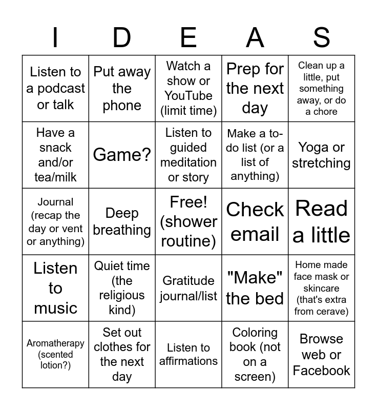 This bingo card has a free space and 24 words: Quiet time (the religious kind), Set out clothes for the next day, Listen to guided meditation or story, Aromatherapy (scented lotion?), Clean up a little, put something away, or do a chore, Listen to a podcast or talk, Have a snack and/or tea/milk, Put away the phone, Check email, Gratitude journal/list, Make a to-do list (or a list of anything), Journal (recap the day or vent or anything), "Make" the bed, Home made face mask or skincare (that's extra from cerave), Game?, Coloring book (not on a screen), Read a little, Watch a show or YouTube (limit time), Yoga or stretching, Deep breathing, Browse web or Facebook, Listen to music, Prep for the next day and Listen to affirmations.