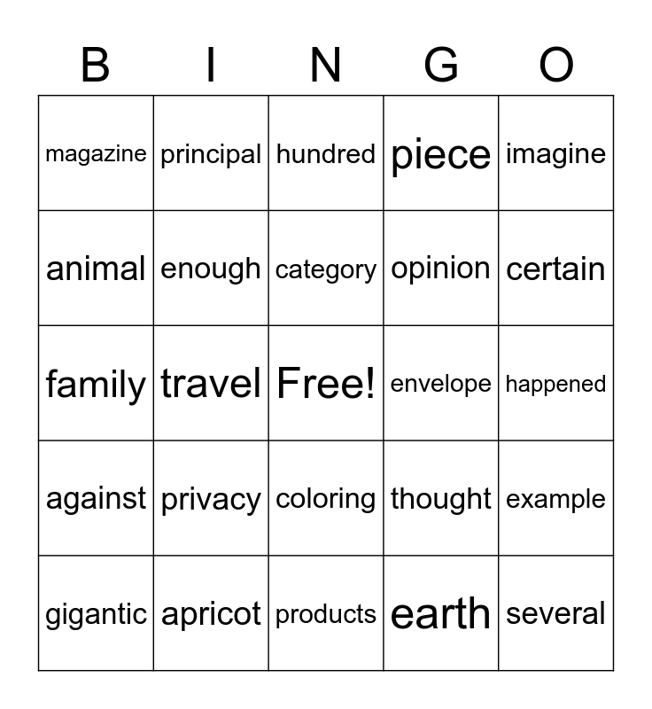 This bingo card has a free space and 24 words: privacy, apricot, category, gigantic, imagine, magazine, animal, principal, envelope, coloring, opinion, family, thought, example, enough, earth, happened, hundred, certain, travel, several, against, piece and products.