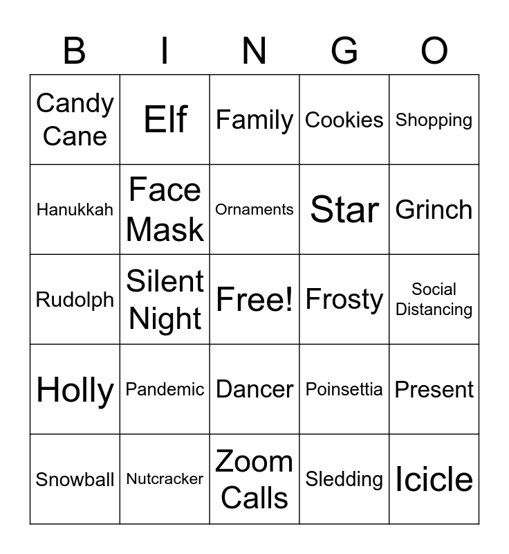 This bingo card has a free space and 24 words: Pandemic, Nutcracker, Ornaments, Snowball, Shopping, Candy Cane, Hanukkah, Elf, Frosty, Dancer, Star, Rudolph, Poinsettia, Present, Face Mask, Sledding, Social Distancing, Family, Grinch, Silent Night, Icicle, Holly, Cookies and Zoom Calls.