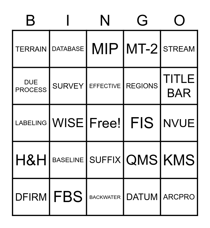 This bingo card has a free space and 29 words: DFIRM, FEMA, WISE, WATER, TERRAIN, MIP, SURVEY, BASELINE, FIS, FBS, NVUE, ARCPRO, BACKWATER, DATUM, TITLE BAR, PANEL, SUFFIX, H&H, STREAM, LABELING, QMS, CONTRACT, REGIONS, DUE PROCESS, MT-2, DATABASE, KMS, EFFECTIVE and PRELIMINARY.