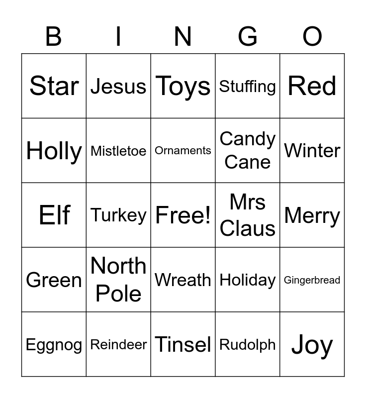 This bingo card has a free space and 40 words: Santa, Elf, Sleigh, Mistletoe, Reindeer, Wreath, Ornaments, Lights, Red, Green, Turkey, Stuffing, Joy, Merry, Mrs Claus, North Pole, Cupid, Star, Presents, Toys, Gingerbread, Rudolph, Candy Cane, Holly, Hat, Jolly, Tree, Bells, Cookie, Peppermint, Christmas Carols, Eggnog, December, Holiday, Winter, Tinsel, Decorations, Ho Ho Ho, Jesus and Bethlehem.