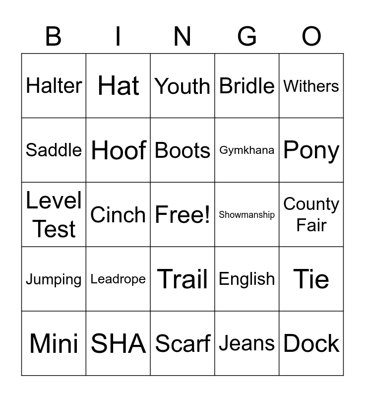 This bingo card has a free space and 49 words: Mane, Dock, Pad, Scarf, Leadrope, Tail, Hat, Shoes, Saddle, Grooming, Hoof, Bridle, Tie, English, Fetlock, Reins, Boots, Showmanship, Western, Withers, Cinch, Jeans, Halter, Gymkhana, In hand, Pony, Mini, Horse, Trail, Jumping, Pattern, Belt, Number, Judge, SHA, Brookside, RMEC, Triple Crown, County Fair, Horse Classic, State Fair, GroomSquad, Performance Test, Competitive Trail Ride, Level Test, Youth, Key Leaders, Jen and Leaders.