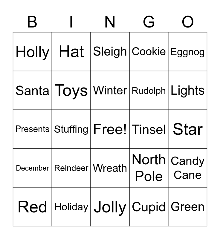 This bingo card has a free space and 40 words: Turkey, Stuffing, Christmas Carols, North Pole, Green, Presents, Toys, Gingerbread, Rudolph, Candy Cane, Holly, Hat, Jolly, Cupid, Star, Santa, Elf, Sleigh, Mistletoe, Eggnog, December, Holiday, Winter, Tinsel, Decorations, Ho Ho Ho, Jesus, Bethlehem, Joy, Merry, Mrs Claus, Reindeer, Wreath, Ornaments, Lights, Red, Tree, Bells, Cookie and Peppermint.