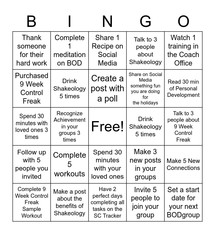 This bingo card has a free space and 24 words: Complete 5 workouts, Make a post about the benefits of Shakeology, Create a post with a poll, Complete 9 Week Control Freak Sample Workout, Watch 1 training in the Coach Office, Thank someone for their hard work, Purchased 9 Week Control Freak, Complete 1 meditation on BOD, Drink Shakeology 5 times, Spend 30 minutes with your loved ones, Share on Social Media something fun you are doing for the holidays, Spend 30 minutes with loved ones 3 times, Make 3 new posts in your groups, Make 5 New Connections, Drink Shakeology 5 times, Invite 5 people to join your group, Talk to 3 people about 9 Week Control Freak, Share 1 Recipe on Social Media, Read 30 min of Personal Development, Recognize Achievement in your groups 3 times, Set a start date for your next BODgroup, Follow up with 5 people you invited, Talk to 3 people about Shakeology and Have 2 perfect days completing all tasks on the SC Tracker.
