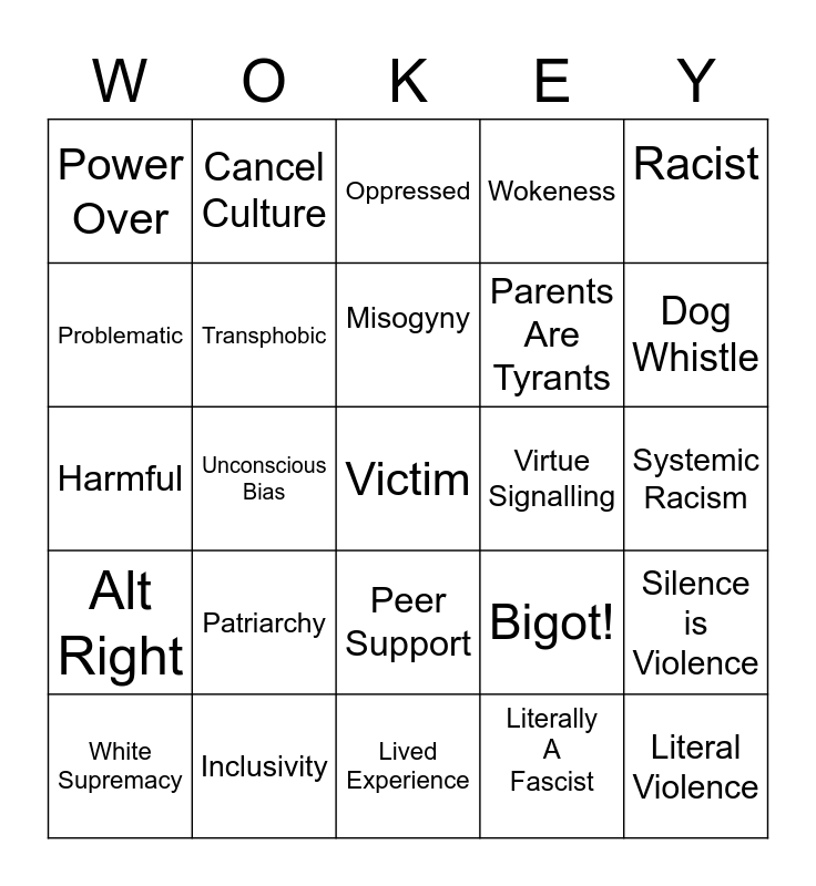 This bingo card has 25 words: Patriarchy, Lived Experience, Misogyny, White Supremacy, Racist, Power Over, Problematic, Cancel Culture, Virtue Signalling, Peer Support, Parents Are Tyrants, Harmful, Bigot!, Silence is Violence, Transphobic, Literal Violence, Systemic Racism, Oppressed, Dog Whistle, Unconscious Bias, Victim, Inclusivity, Alt Right, Wokeness and Literally A Fascist.