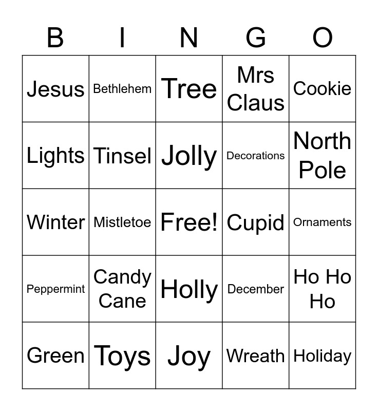 This bingo card has a free space and 40 words: Elf, Mistletoe, Eggnog, December, Holiday, Winter, Tinsel, Sleigh, Decorations, Ho Ho Ho, Jesus, Bethlehem, Joy, Wreath, Ornaments, Lights, Red, Tree, Bells, Cookie, Peppermint, Toys, Jolly, Cupid, Star, Santa, Turkey, Stuffing, Christmas Carols, Gingerbread, Rudolph, Candy Cane, Holly, Hat, North Pole, Green, Presents, Merry, Mrs Claus and Reindeer.