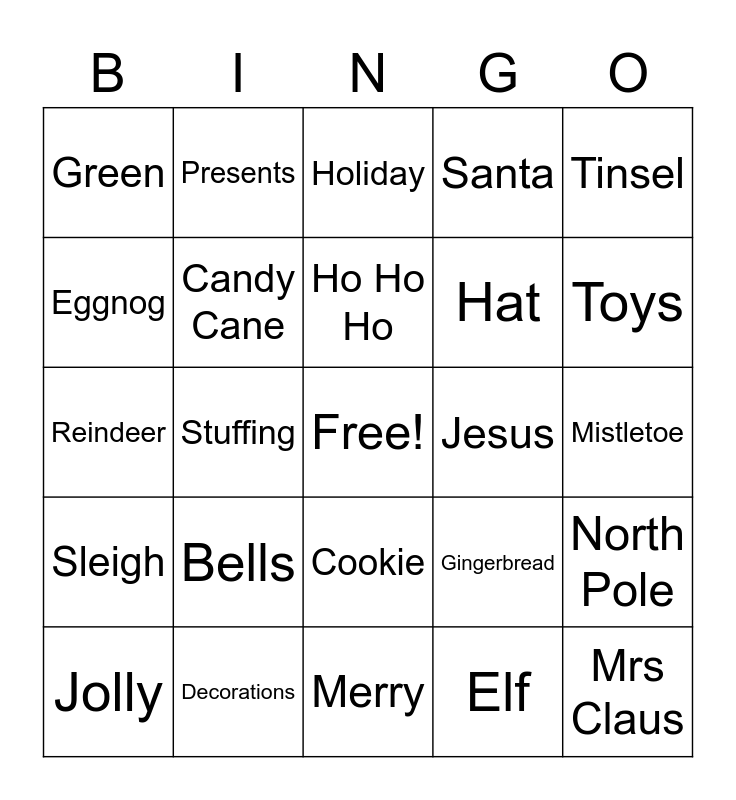 This bingo card has a free space and 40 words: Rudolph, Stuffing, Christmas Carols, Gingerbread, Mrs Claus, Reindeer, Candy Cane, Holly, Hat, North Pole, Green, Presents, Merry, Elf, Mistletoe, Eggnog, December, Holiday, Winter, Tinsel, Sleigh, Decorations, Ho Ho Ho, Jesus, Bethlehem, Joy, Wreath, Ornaments, Lights, Red, Tree, Bells, Cookie, Peppermint, Toys, Jolly, Cupid, Star, Santa and Turkey.