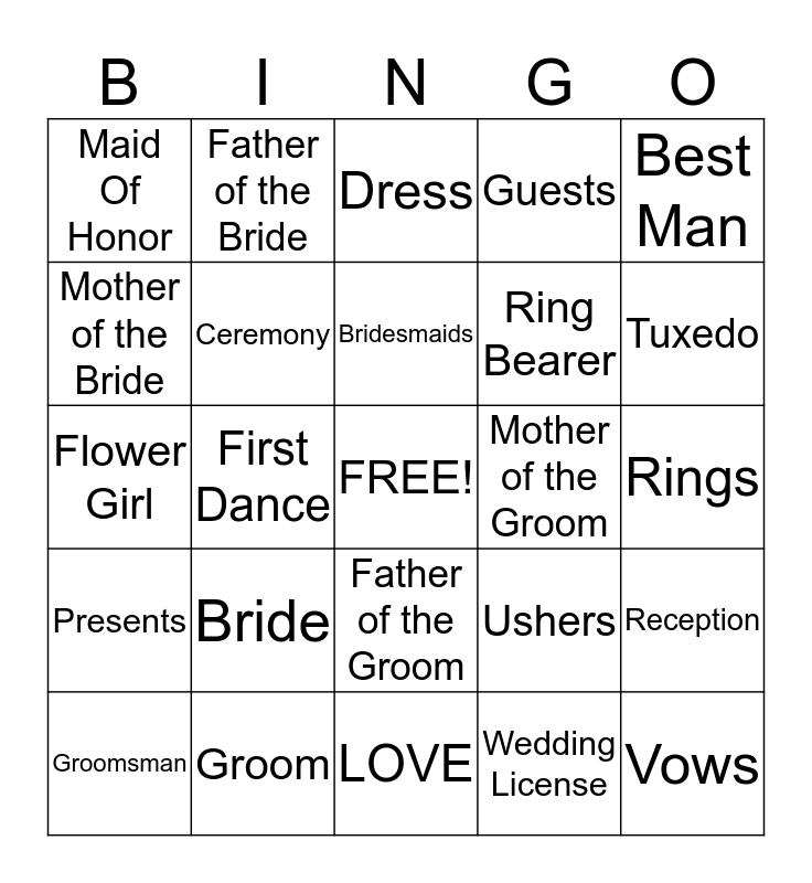This bingo card has a free space and 24 words: Bride, Groom, Bridesmaids, Groomsman, Best Man, Maid Of Honor, Mother of the Bride, Father of the Bride, Mother of the Groom, Father of the Groom, Ring Bearer, Flower Girl, Ushers, Reception, Ceremony, Wedding License, Rings, Dress, Tuxedo, First Dance, Vows, Presents, Guests and LOVE.
