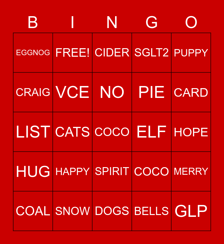 This bingo card has a free space and 51 words: Free!, GLP, LILLY, DOGS, HAPPY, JOY, FREE!, BOW, CRAIG, GAMES, VCE, SGLT2, MERRY, COCO, GAME, YES, NO, ELF, MILK, PUPPY, CATS, BELLS, EGGNOG, PIE, CAKE, BOX, CARD, CHILL, COAL, CIDER, COOKIE, EVE, FEAST, FIR, FROSTY, SNOW, COLD, HOT, GUEST, GIVE, HOPE, HUG, ICEY, IVY, LOVE, LOG, LIST, PARTY, SLED, SPIRIT and ZOE.