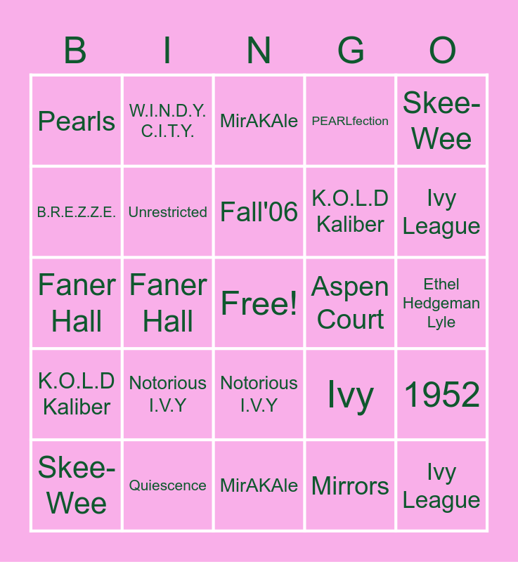 This bingo card has a free space and 50 words: Ivyprofen, Ivy League, Poison-N-Ivy, MirAKAle, Notorious I.V.Y, Pearlessence, W.I.N.D.Y. C.I.T.Y., HurricAKAne, B.R.E.Z.Z.E., Quiescence, Unrestricted, PEARLfection, 1952, Ivy, Ethel Hedgeman Lyle, Delta Beta, Fall'06, Aspen Court, Mr Kabacho, Skee-Wee, Faner Hall, Mirrors, Pearls, K.O.L.D Kaliber, 1908, Ivyprofen, Ivy League, Poison-N-Ivy, MirAKAle, Notorious I.V.Y, Pearlessence, W.I.N.D.Y. C.I.T.Y., HurricAKAne, B.R.E.E.Z.E., Quiescence, Unrestricted, PEARLfection, 1952, Ivy, Ethel Hedgeman Lyle, Delta Beta, Fall'06, Aspen Court, Mr. Kabacho, Skee-Wee, Faner Hall, AKA, Pearls, K.O.L.D Kaliber and 1908.