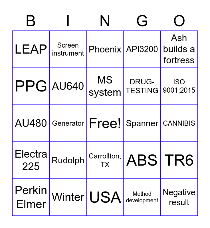 This bingo card has a free space and 75 words: Olympus, TQD, Phoenix, Mindray, IA OEM, Peak, Nitrogen generator, Indiko, Leybold, Pump, Blower, Turbo, MS system, PPG, LCMS calibration kit, Generator, Positive result, Negative result, BS200, Ash builds a fortress, AU400, AU480, AU640, Screen instrument, API3200, API4500, Blue Box Line, API4000, confirmation instrument., BS800, Reagents, Chemicals, Consumables, ABS, ISO 9001:2015, DRUG-TESTING, ANALYZERS, ABS LABS, CANNIBIS, Method development, Validation, Lab support, LIS, SCIEX, Shimadzu, Agilent, Perkin Elmer, LEAP, Waters, CLIA accreditation, Operator Training, Carrollton, TX, Wash Solution, Calibrators, LCMS Grade, Parker Balston, Cost per sample, Elf on a shelf, Merry Christmas, The Grinch, Rudolph, Mistletoe, Waffles, Bonnet, Boot, Spanner, Broken axle, Supercharger, Roll Tide, TR6, Electra 225, Winter, IT, USA and Canada.