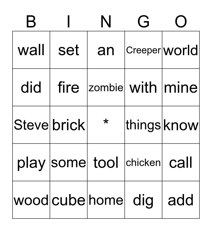 This bingo card has a free space and 24 words: some, cube, zombie, wood, world, wall, did, set, things, tool, with, Steve, chicken, call, fire, dig, know, an, mine, brick, add, play, Creeper and home.