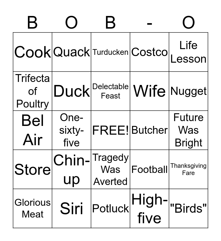 This bingo card has a free space and 27 words: Football, Newspaper, Wife, Potluck, Trifecta of Poultry, Turducken, Quack, Store, Butcher, Thanksgiving Fare, Bel Air, Costco, Glorious Meat, Siri, Nugget, Employee, Duck, Delectable Feast, Chin-up, Cook, Future Was Bright, High-five, One-sixty-five, "Birds", Tragedy Was Averted, Life Lesson and Pre-order.