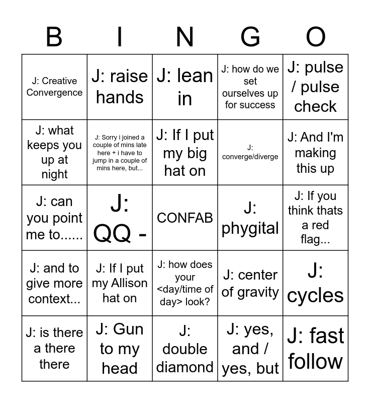 This bingo card has a free space and 27 words: J: center of gravity, J: ecosystem, J: converge/diverge, J: double diamond, J: what keeps you up at night, J: lean in, J: raise hands, J: and to give more context..., J: phygital, J: cycles, J: can you point me to......, J: how do we set ourselves up for success, J: is there a there there, J: Gun to my head, J: And I'm making this up, J: <scratching head>, J: Sorry i joined a couple of mins late here + i have to jump in a couple of mins here, but..., J: If I put my big hat on, J: If I put my Allison hat on, J: Creative Convergence, J: If you think thats a red flag..., J: yes, and / yes, but, J: QQ -, J: fast follow, J: how does your <day/time of day> look?, J: pulse / pulse check and J: and to be mindful of time here....