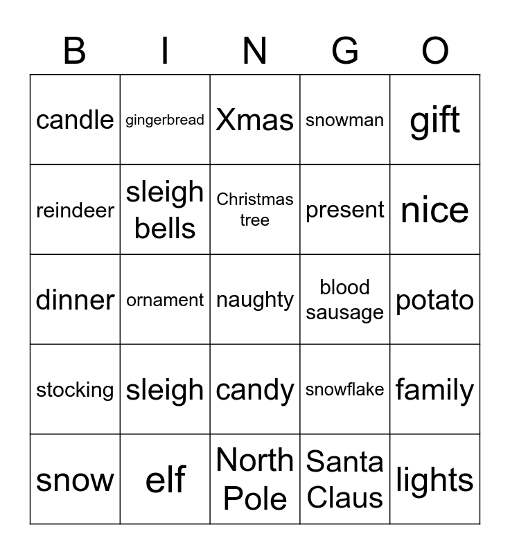 This bingo card has 26 words: candy, Santa Claus, Christmas tree, elf, gift, candle, reindeer, gingerbread, potato, snowflake, present, dinner, family, snow, ornament, ice, snowman, stocking, Xmas, naughty, nice, North Pole, blood sausage, sleigh, sleigh bells and lights.