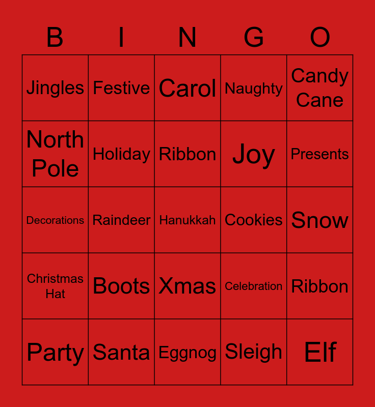 This bingo card has 30 words: Santa, Rudolf, Raindeer, Socks, Jingles, Carol, Holiday, Xmas, Cookies, Eggnog, Snow, Hanukkah, Sleigh, Elf, Presents, Gingerbread, Celebration, Christmas Hat, Boots, Candy Cane, Decorations, Feast, Festive, Joy, North Pole, Naughty, Ribbon, Party, Ribbon and Sweater.