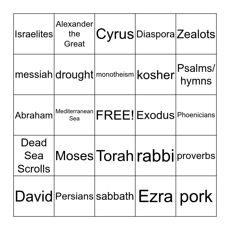This bingo card has a free space and 26 words: Torah, Ezra, monotheism, Persians, Zealots, Israelites, messiah, Alexander the Great, Phoenicians, rabbi, kosher, Abraham, proverbs, David, Mediterranean Sea, prophets, Diaspora, Dead Sea Scrolls, Cyrus, pork, Psalms/ hymns, sabbath, Exodus, Moses, drought and Babylonian Captivity.
