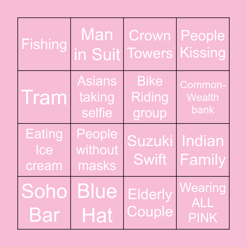 This bingo card has 38 words: Australia-Flag, Victoria University, Graffiti, Bike Riding group, Walking the Dog, Couple holding hands, Common-Wealth bank, Clock Face, Tram, Eating Ice cream, Indian Family, People Kissing, Soho Bar, Elderly Couple, Asians taking selfie, Wearing ALL PINK, Mullet Hairstyle, Crown Towers, Wooden Pier/Jetty, Blue Hat, Fishing, Heli-copter, People without masks, Rowing Squad, Drinking Cocktails, Bald Man, Train, Person on Balcony, Flowers, Bird, Back pack, Another On A Boat, Christmas Decor, Man in Suit, Long Beard or Mo, White Tee, Suzuki Swift and Person Reading.