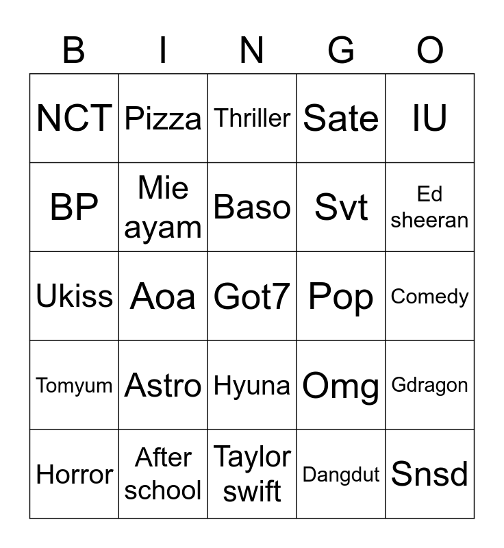 This bingo card has a free space and 24 words: Astro, After school, Baso, Horror, IU, NCT, BP, Pizza, Pop, Hyuna, Svt, Ukiss, Omg, Gdragon, Mie ayam, Dangdut, Comedy, Thriller, Ed sheeran, Aoa, Snsd, Tomyum, Sate and Taylor swift.