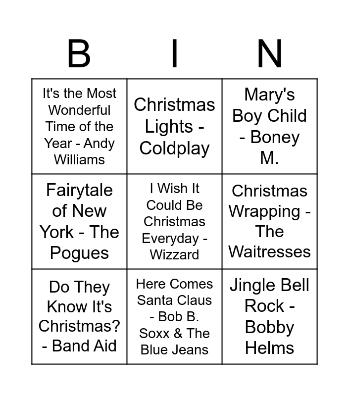 This bingo card has 50 words: 2000 Miles - Pretenders, A Spaceman Came Travelling - Chris de Burgh, All I Want for Christmas Is You - Mariah Carey, Baby It's Cold Outside - Ella Fitzgerald, Carol of the Bells - Home Alone, Christmas - Darlene Love, Christmas Lights - Coldplay, Christmas Time - The Darkness, Christmas Wrapping - The Waitresses, Deck The Hall - Nat King Cole, Do They Know It's Christmas? - Band Aid, Fairytale of New York - The Pogues, Feliz Navidad - Jose Feliciano, Frosty the Snowman - The Ronettes, Happy Xmas - John Lennon, Have Yourself A Merry Little Christmas - Sam Smith, Here Comes Santa Claus - Bob B. Soxx & The Blue Jeans, I Believe in Father Christmas - Greg Lake, I Saw Mommy Kissing Santa Claus - The Jackson 5, I Wish It Could Be Christmas Everyday - Wizzard, In Dulci Jubilo - Mike Oldfield, It's Beginning to Look a Lot like Christmas - Michael Buble, It's the Most Wonderful Time of the Year - Andy Williams, Jingle Bell Rock - Bobby Helms, Last Christmas - Wham!, Little Saint Nick - The Beach Boys, Lonely This Christmas - Mud, Main Title from Home Alone - John Williams, Mary's Boy Child - Boney M., Merry Christmas Everyone - Shakin' Stevens, Merry Xmas Everybody - Slade, Mistletoe and Wine - Cliff Richard, One More Sleep - Leona Lewis, Rockin' Around The Christmas Tree - Johnny Marks, Rockin' Robin - Michael Jackson, Run Rudolph Run - Chuck Berry, Santa Baby - Eartha Kitt, Santa's Coming for Us - Sia, Silent Night - Bing Crosby, Sleigh Ride - The Ronettes, Somewhere Only We Know - Lily Allen, Stay Another Day - East 17, Step Into Christmas - Elton John, Stop The Cavalry - Jona Lewie, The Christmas Song - Mel Torme, The Christmas Song - Nat King Cole, Underneath the Tree - Kelly Clarkson, Walking in the Air - Aled Jones, White Christmas - Bing Crosby and Wonderful Christmastime - Paul McCartney.