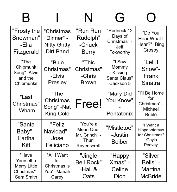 This bingo card has a free space and 29 words: "Have Yourself a Merry Little Christmas" -Sam Smith, "It's the Most Wonderful Time of the Year" -Andy Williams, "The Christmas Song" -Nat King Cole, "Sleigh Ride" -The Ronettes, "Frosty the Snowman" -Ella Fitzgerald, "Run Run Rudolph" -Chuck Berry, "Blue Christmas" -Elvis Presley, "Feliz Navidad" -Jose Feliciano, "Mary Did You Know" -Pentatonix, "All I Want for Christmas is You" -Mariah Carey, "I'll Be Home for Christmas" -Michael Bublé, "Silver Bells" -Martina McBride, "Jingle Bell Rock" -Hall & Oats, "Happy Xmas" - Celine Dion, "Let It Snow"-Frank Sinatra, "Rockin' Around the Christmas Tree" -Brenda Lee, "You're a Mean One, Mr. Grinch" -Thurl Ravenscroft, "Santa Baby" -Eartha Kitt, "Do You Hear What I Hear?" -Bing Crosby, "Last Christmas" -Wham, "Mistletoe" -Justin Beiber, "Merry Christmas, Happy Holidays" -*NSYNC, "I Saw Mommy Kissing Santa Claus" -Jackson 5, "The Chipmunk Song" -Alvin and the Chipmunks, "Redneck 12 Days of Christmas" -Jeff Foxworthy, "Christmas Dinner" -Nitty Gritty Dirt Band, "I Want a Hippopotamus for Christmas" -Gayla Peevey, "This Christmas" -Chris Brown and "Grandma Got Run Over by a Reindeer" -Elmo and Patsy.