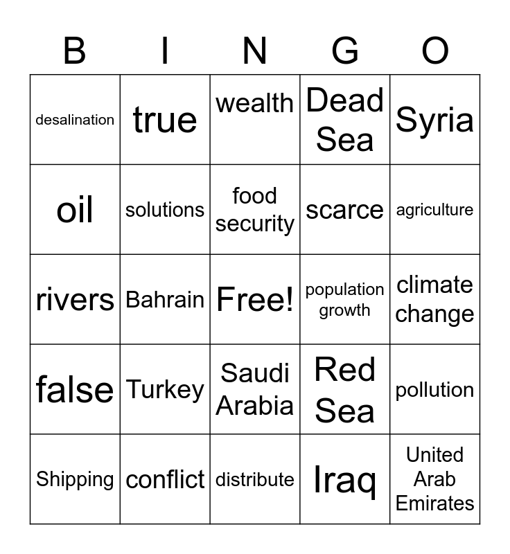 This bingo card has a free space and 27 words: Red Sea, Jordan River, scarce, distribute, oil, wealth, true, false, population growth, pollution, rivers, Dead Sea, Shipping, conflict, agriculture, Suez Canal, solutions, food security, Turkey, desalination, climate change, Iraq, Bahrain, United Arab Emirates, Saudi Arabia, Syria and Israel.