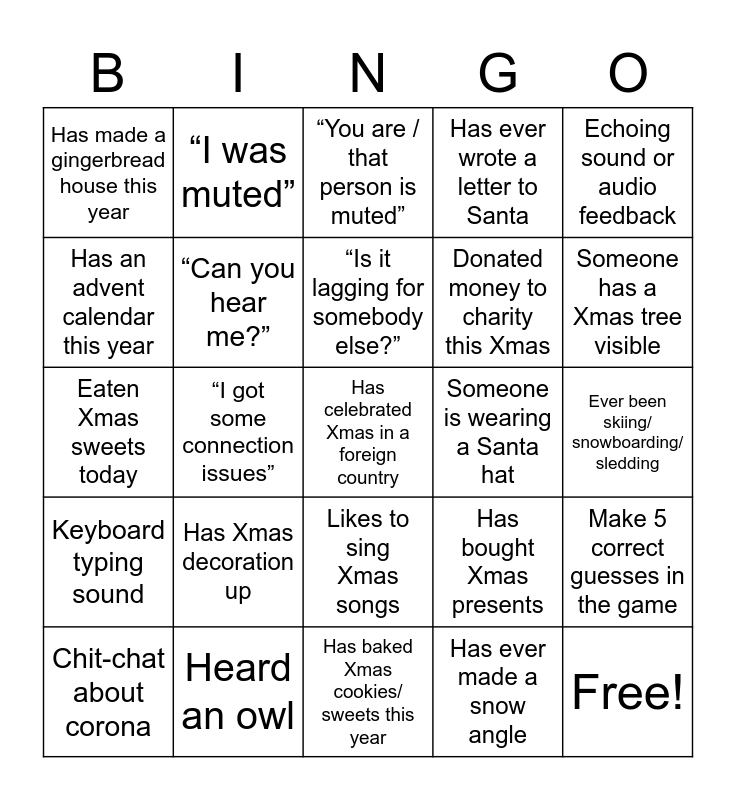 This bingo card has 33 words: Free!, “Let’s wait for the others”, “I got some connection issues”, “Turn on your webcam”, Keyboard typing sound, “Can you hear me?”, Echoing sound or audio feedback, Chit-chat about corona, “I was muted”, Seeing a pet or family member, “Is it lagging for somebody else?”, “You are / that person is muted”, Arguing about who to talk first, “Can everyone see my screen?”, Someone is wearing a Santa hat, Someone has a Xmas tree visible, Heard an owl, Eaten Xmas sweets today, Has Xmas decoration up, Has bought Xmas presents, Likes to sing Xmas songs, Love holiday movies, Has made a gingerbread house this year, Ever been skiing/ snowboarding/ sledding, Has baked Xmas cookies/ sweets this year, Has celebrated Xmas in a foreign country, Has ever wrote a letter to Santa, Donated money to charity this Xmas, Has an advent calendar this year, Make 5 correct guesses in the game, Has made a snow man, Has ever made a snow angle and Has visited a Xmas market.