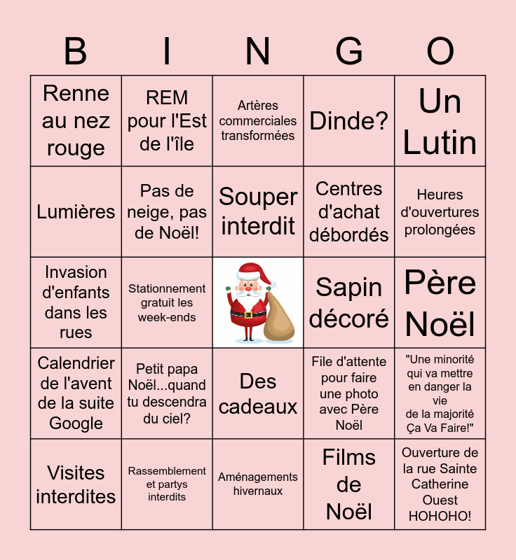 This bingo card has a free space and 24 words: Petit papa Noël...quand tu descendra du ciel?, Rassemblement et partys interdits, Souper interdit, Visites interdites, Un Lutin, Renne au nez rouge, Lumières, REM pour l'Est de l'île, Sapin décoré, Des cadeaux, Centres d'achat débordés, Invasion d'enfants dans les rues, File d'attente pour faire une photo avec Père Noël, "Une minorité qui va mettre en danger la vie de la majorité Ça Va Faire!", Pas de neige, pas de Noël!, Films de Noël, Père Noël, Artères commerciales transformées, Heures d'ouvertures prolongées, Stationnement gratuit les week-ends, Ouverture de la rue Sainte Catherine Ouest HOHOHO!, Calendrier de l'avent de la suite Google, Dinde? and Aménagements hivernaux.