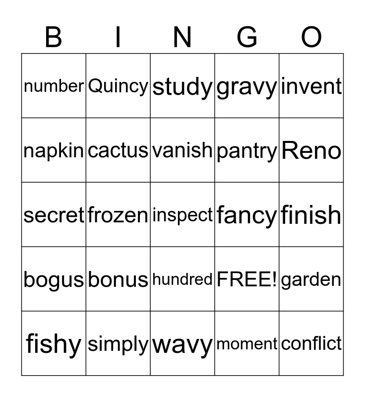 This bingo card has 25 words: bonus, wavy, vanish, fishy, invent, number, napkin, Quincy, fancy, hundred, pantry, secret, FREE!, garden, cactus, conflict, finish, study, Reno, frozen, inspect, simply, bogus, gravy and moment.