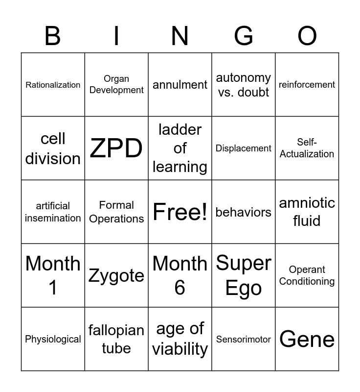 This bingo card has a free space and 48 words: Father, Gene, Trait, age of viability, Zygote, Umbilical Cord, Organ Development, Week 9, cell division, implantation, ZPD, autonomy vs. doubt, Operant Conditioning, Super Ego, Ego, 8, ladder of learning, behaviors, punishment, reinforcement, Formal Operations, Sensorimotor, Rationalization, Displacement, Projection, Self-Actualization, Physiological, Esteem, Month 6, Month 1, Month 4, Stay the Same, 25-35, protein, fallopian tube, sperm, surrogate, amniotic fluid, embryonic, custody, polygamy, prenuptial agreement, annulment, group homes, artificial insemination, temporary legal guardian, child neglect and Loving vs. Virginia.
