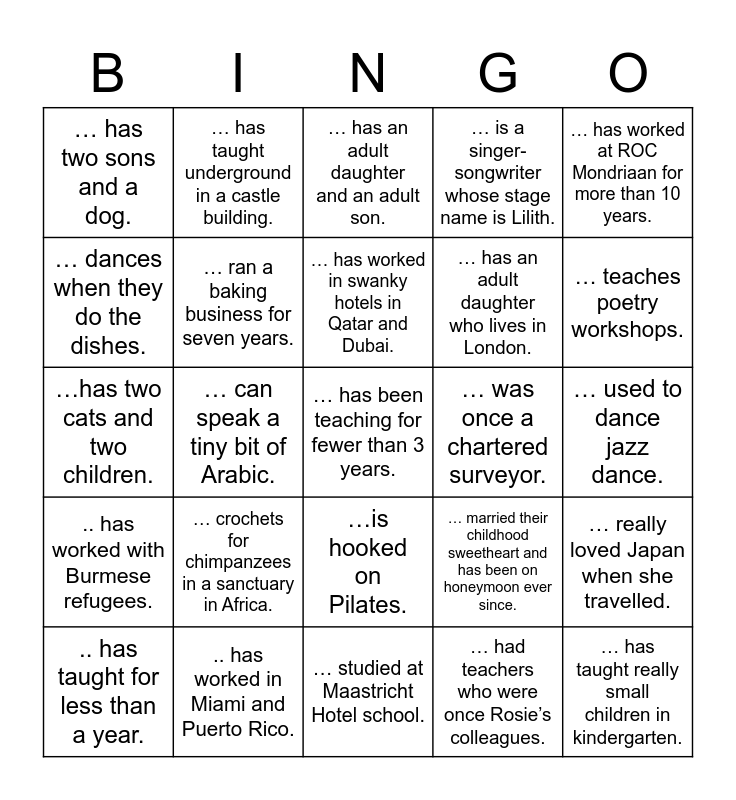This bingo card has 25 words: … crochets for chimpanzees in a sanctuary in Africa., … studied at Maastricht Hotel school., … has worked in swanky hotels in Qatar and Dubai., .. has taught for less than a year., … has worked at ROC Mondriaan for more than 10 years., … has two sons and a dog., … dances when they do the dishes., … has taught underground in a castle building., … was once a chartered surveyor., …is hooked on Pilates., … has an adult daughter who lives in London., …has two cats and two children., … married their childhood sweetheart and has been on honeymoon ever since., … really loved Japan when she travelled., … ran a baking business for seven years., … has taught really small children in kindergarten., … used to dance jazz dance., … has an adult daughter and an adult son., … teaches poetry workshops., … can speak a tiny bit of Arabic., … has been teaching for fewer than 3 years., .. has worked in Miami and Puerto Rico., .. has worked with Burmese refugees., … is a singer-songwriter whose stage name is Lilith. and … had teachers who were once Rosie’s colleagues..