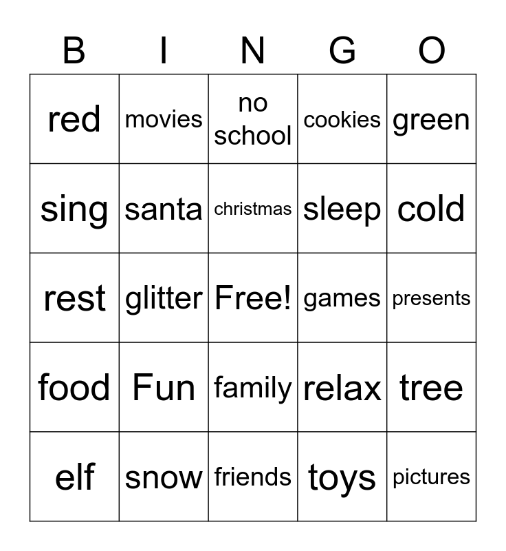 This bingo card has a free space and 24 words: Fun, snow, christmas, elf, green, red, sing, movies, games, family, sleep, rest, relax, tree, santa, toys, presents, no school, cold, glitter, pictures, food, cookies and friends.