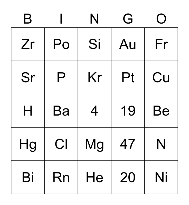 This bingo card has a free space and 40 words: F, H, Fe, P, Rn, Mg, Kr, 7, Fr, Hg, Ba, Au, Ni, Be, 19, Cl, I, Zr, B, Si, N, 20, Pt, Sr, Ne, Ra, 16, Pb, Ge, Ca, K, Bi, Zn, 47, Cu, He, 6, Na, Po and S.