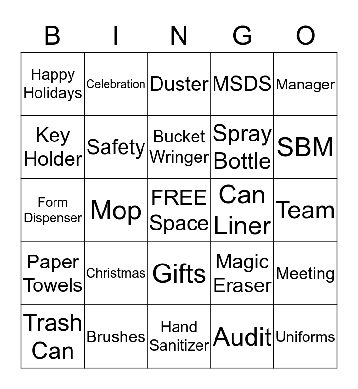 This bingo card has a free space and 24 words: Christmas, Brushes, Bucket Wringer, Trash Can, Manager, Happy Holidays, Key Holder, Celebration, Can Liner, Gifts, Spray Bottle, Form Dispenser, Magic Eraser, Meeting, Safety, Audit, Team, Duster, SBM, Mop, Uniforms, Paper Towels, MSDS and Hand Sanitizer.