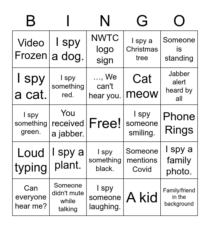This bingo card has a free space and 24 words: I spy a plant., Someone didn't mute while talking, …, We can't hear you., Can everyone hear me?, Someone is standing, Video Frozen, I spy a cat., I spy a dog., I spy someone smiling., I spy something black., Cat meow, I spy something green., Someone mentions Covid, I spy a family photo., I spy something red., A kid, Phone Rings, NWTC logo sign, Jabber alert heard by all, You received a jabber., Family/friend in the background, Loud typing, I spy a Christmas tree and I spy someone laughing..