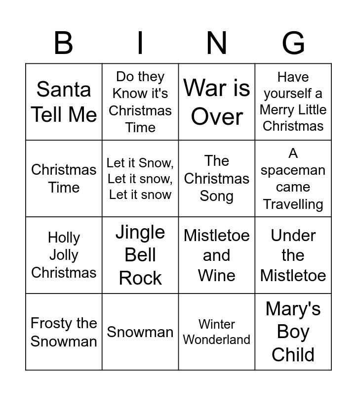 This bingo card has 16 words: Snowman, Under the Mistletoe, War is Over, Santa Tell Me, Holly Jolly Christmas, Do they Know it's Christmas Time, Mistletoe and Wine, Winter Wonderland, Christmas Time, Let it Snow, Let it snow, Let it snow, Frosty the Snowman, Have yourself a Merry Little Christmas, Jingle Bell Rock, A spaceman came Travelling, The Christmas Song and Mary's Boy Child.