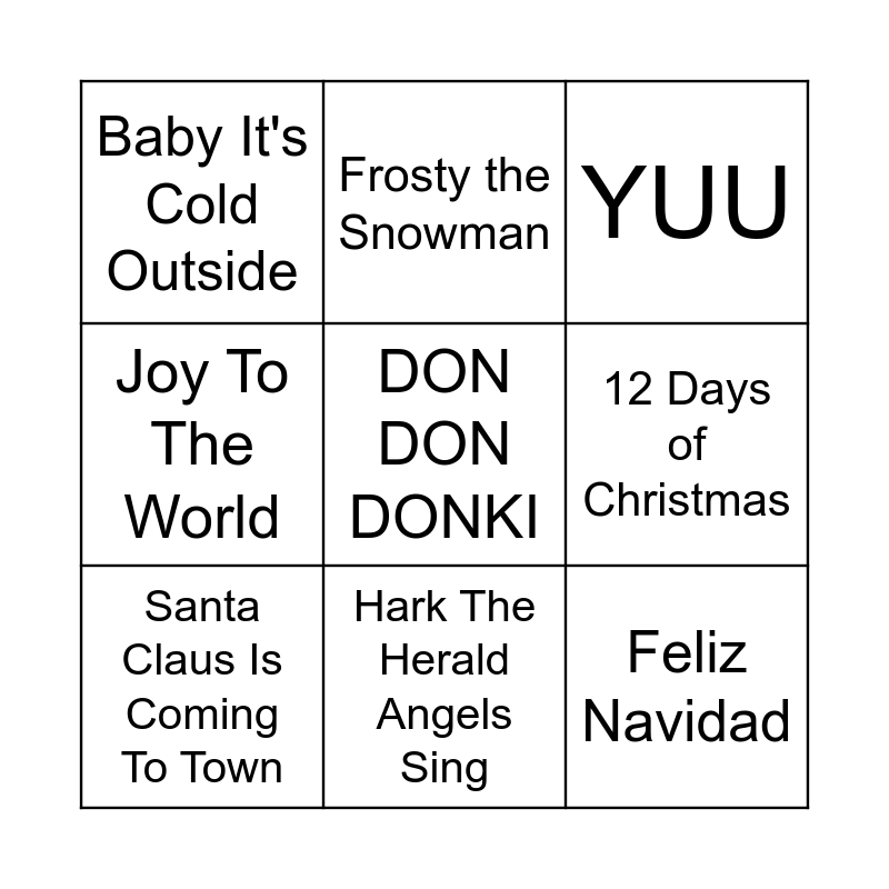 This bingo card has 24 words: Rudolph The Red-Nosed Reindeer, Baby Shark, Hark The Herald Angels Sing, Let it Go, DON DON DONKI, Baby It's Cold Outside, 12 Days of Christmas, Frosty the Snowman, We Wish You A Merry Christmas, Let it Snow, Let it Snow, Let it Snow, Feliz Navidad, It's Beginning To Look A Lot Like Christmas, Do you want to build a Snowman?, All I Want for Christmas Is You, Santa Claus Is Coming To Town, Santa Baby, Jingle Bell Rock, YUU, Winter Wonderland, Jingle Bells, Last Christmas, Have Yourself A Merry Little Christmas, Joy To The World and Deck the Halls.