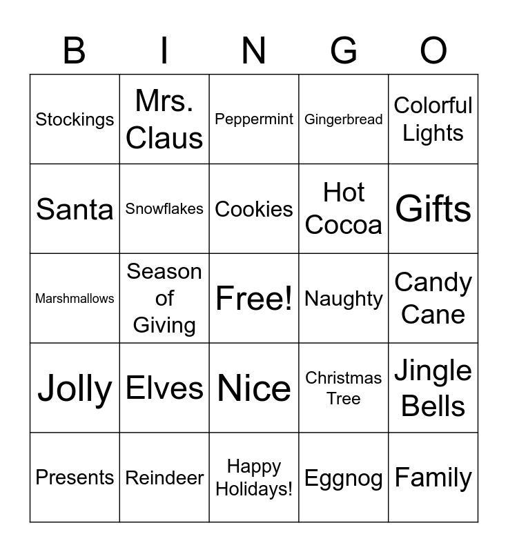This bingo card has a free space and 24 words: Elves, Reindeer, Cookies, Presents, Colorful Lights, Stockings, Santa, Mrs. Claus, Naughty, Nice, Hot Cocoa, Marshmallows, Christmas Tree, Jingle Bells, Snowflakes, Eggnog, Candy Cane, Peppermint, Gifts, Season of Giving, Family, Jolly, Gingerbread and Happy Holidays!.
