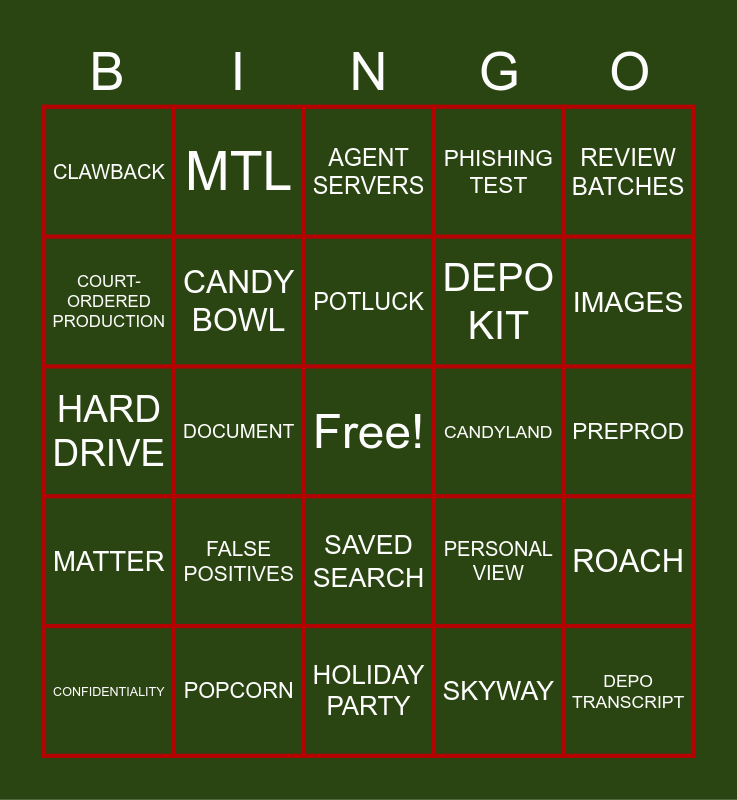 This bingo card has a free space and 84 words: 26TH FLOOR COFFEE, 333 – NEW REVIEW CENTER, AGENT SERVERS, BAD GUY REVIEW, BATCH SUMMARIES, BATES NUMBER, BREAKING FAMILIES, BROKEN ESCALATOR, BROKEN FOUNTAIN, BULLETIN BOARD, CAL REVIEW, CALLER LIST, CANDY BOWL, CANDYLAND, CITRIX, CLAWBACK, CONFIDENTIALITY, COURT-ORDERED PRODUCTION, CRAFT FAIR, DAILY ZOOM, DATABASE, DEPO KIT, DEPO TRANSCRIPT, DOC REQUEST, DOCUMENT, DT SEARCH, EMAIL, EMAIL THREAD, ESI STIP, EXPERT REPORTS, FALSE POSITIVES, GOOD GUY REVIEW, HAND SANITIZER, HARD DRIVE, HASH VALUE, HIDDEN CONTENT, HOLIDAY PARTY, HOSTING, IMAGES, MATTER, METADATA, MISSING CUSTODIAN, MOBILE DEVICE COLLECTION, MOCK JURY, MOTION TO COMPEL, MR OANES, MTL, MUTE BUTTON, OKTA, OVERTURNS, PDF, PERSONAL VIEW, PHISHING TEST, PLACEHOLDER SLIPSHEET, PLANTS, PM TABLE, POPCORN, POTLUCK, PRE-HOLIDAY EMERGENCY, PREPROD, PRIV LOG, PRIV WASH, PRODUCTION LOG, PROTECTIVE ORDER, QC SEARCHES, RED LAPTOP, REDACTIONS, RELATIVITY, REVIEW BATCHES, REVIEW MEMO, ROACH, RUSH PRODUCTION, SAMPLE SALE, SANCTIONS, SAVED SEARCH, SKYWAY, SNACK CABINET, SOFTWARE, STR, TIFF, TRIAL EXHIBIT, VITALITY WALK, WINDOW WASHERS and ZOOM.